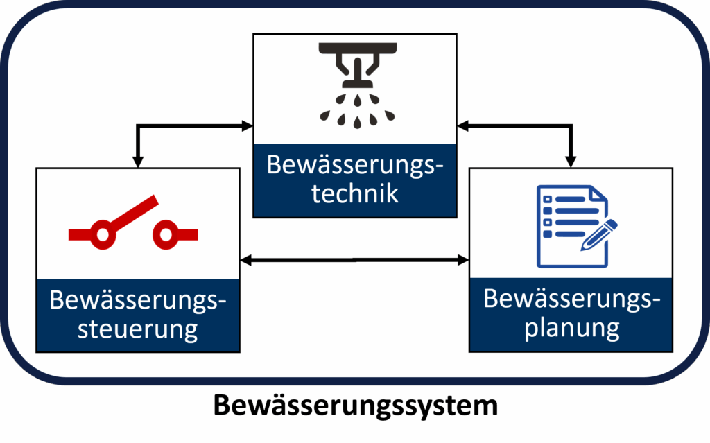 Einheit aus Komponenten zur Durchführung einer Bewässerung. Ein Bewässerungssystem setzt sich üblicherweise aus unterschiedlichen Komponenten der Bewässerungstechnik (Wasserbereitstellung, Wasseraufbereitung, Wassertransport, Wasserapplikation) sowie Komponenten der Bewässerungsplanung und Bewässerungssteuerung zusammen.