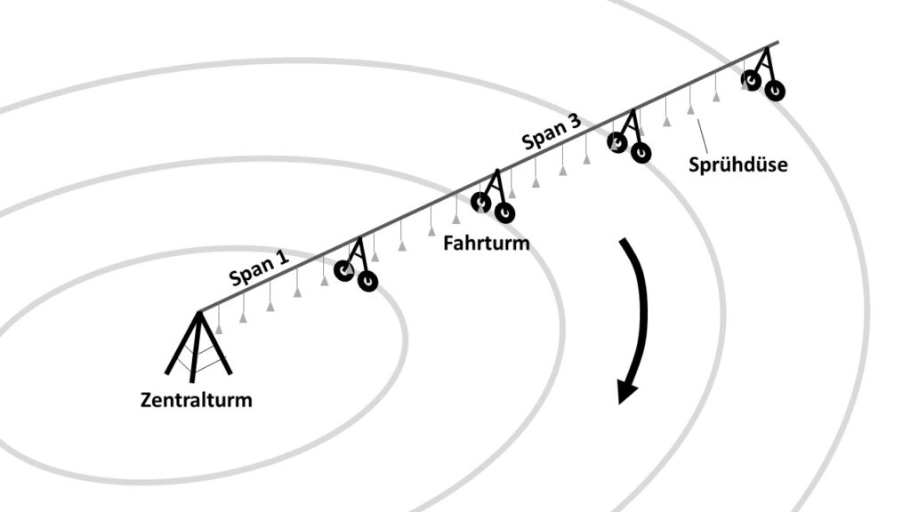 Die Kreisberegnungsmaschine (Kreisberegnungsanlage, Pivot-System, Center-Pivot-Irrigation) gehört zu den mobilen Bewässerungsverfahren. Sie besitzt ein mobiles Wasserrohr, an dem Sprühdüsen oder Regner installiert sind. Ein Ende des Wasserrohrs ist an einer zentralen, drehbaren Achse (Zentralturm, pivot (franz.) = Drehpunkt) fixiert und wird von dort mit Wasser versorgt. Zusätzlich wird das Wasserrohr durch Fahrtürme getragen, die eine Rotation des Wasserrohrs um den Zentralturm ermöglichen, wodurch eine kreisförmige Beregnungsfläche entsteht. Die Fahrtürme werden meistens durch Elektromotoren angetrieben. Die hierfür nötige Stromversorgung erfolgt ebenfalls über den Zentralturm. Zwischen Zentralturm und anschließendem Fahrturm sowie zwischen den weiteren Fahrtürmen selbst wird das Wasserrohr durch ein Trägergerüst gehalten und stabilisiert. Trägergerüst, Wasserrohr und Stromversorgung zwischen den Türmen bilden den Span. Die Spans haben üblicherweise eine Länge zwischen 30 und 60m, wobei die Spanlänge insbesondere an die Topografie angepasst wird und so innerhalb der Anlage variieren kann. Eine gelenkartige Verbindung (z.B. Gummimuffe) des Wasserrohrs an den Fahrtürmen stellt die nötige Flexibilität bezüglich vertikaler und horizontaler Bewegungen und Verdrehungen sicher und verhindert so Verspannungen und entsprechende Schäden am Wasserrohr.