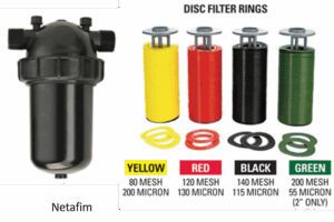 Scheibenfilter (disc filter) bestehen aus 100-200 ca. 1mm dicken, aus Kunststoff gefertigten ringförmigen Scheiben, mit beidseitig gerillten Oberflächen. Werden die Scheiben übereinandergelegt und zusammengedrückt, bilden sich zwischen den Oberflächen verengte Fließquerschnitte aus. Die verfügbaren Maschenweiten liegen zwischen ca. 20 μm und 400 μm. Aufgrund des im Vergleich zum Siebfilter längeren Filterwegs sind Scheibenfilter auch für den Einsatz bei algenhaltigem Wasser geeignet. In vielen Filtergehäusen können Scheiben- und Siebfiltereinsätze (→ Siebfilter) alternativ eingesetzt bzw. getauscht werden.