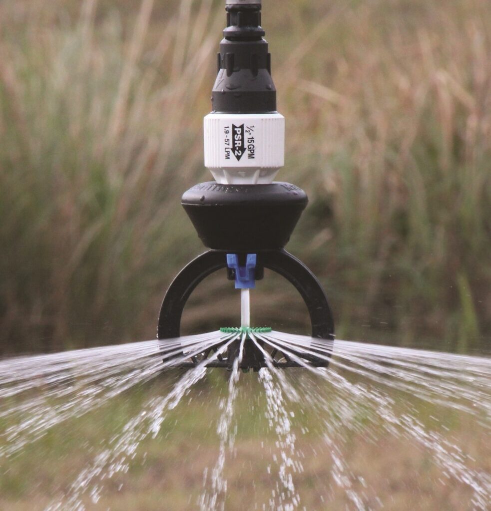 Zur Wasserausbringung werden bei mobilen Bewässerungsverfahren oftmals Sprühdüsen eingesetzt. Sprühdüsen können unbewegliche oder rotierende Auslassöffnungen besitzen und applizieren das Wasser zumeist strahl- oder sprühförmig. Im Gegensatz zu den Regnern der Rohrberegnung haben sie eine geringere Wurfweite und einen geringeren Wasserdurchfluss. Die Sprühdüsen sind an den Auslegerstativen vorzugsweise hängend installiert. Sie benötigen mit 1 bis 2 bar deutlich weniger Wasserdruck als Starkregner, wobei Niederdruck-Sprühdüsen auch Wasserdrücke deutlich unter 1 bar erlauben. Ein Vorteil gegenüber Starkregnern auf Regenwagen ist die geringere Windanfälligkeit und damit verbunden eine homogenere Wasserapplikation, da sowohl Wurfhöhe, als auch Wurfweite wesentlich geringer sind. Durch geringere Wurfhöhen und Wurfweiten sind zudem die Verdunstungsverluste kleiner und somit ein geringerer Wasserverbrauch möglich. Schließlich ist der Einsatz von Sprühdüsen im Vergleich zu Starkregner auch energieeffizienter, da das Wasser mit deutlich geringerem Wasserdruck appliziert wird.