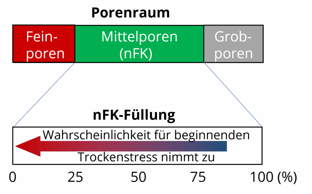 Da pflanzenverfügbares Wasser in Mittelporen gebunden ist (→ nFK), ist Trockenstress immer mit einer Veränderung der nFK-Füllung verbunden, wobei die Wahrscheinlichkeit für beginnenden Trockenstress – für jede Pflanze unterschiedlich – mit abnehmender nFK-Füllung zunimmt (→ leicht verfügbares Wasser).