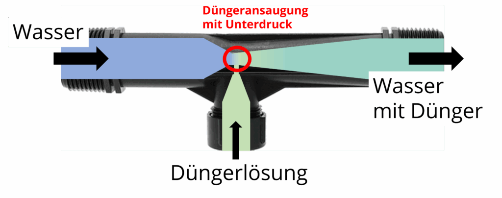 Die Düngereinspeisung in das Bewässerungswasser mit Venturi-Injektoren ist einfach, kostengünstig und weit verbreitet. Nach dem Venturi-Prinzip wird durch eine Verengung des Fließquerschnitts die Fließgeschwindigkeit des Wassers erhöht, wodurch bei der nachfolgenden Fließquerschnitt-Erweiterung ein Unterdruck entsteht. Durch den Unterdruck kann über eine Öffnung Flüssigdünger angesaugt und mit dem Wasser vermischt werden. Die Düngerkonzentration im Bewässerungswasser ist vom Wasserdruck am Venturi-Injektor und von der Fließgeschwindigkeit des Wassers abhängig und somit bei Druckschwankungen im Bewässerungssystem nicht konstant. Der Venturi-Injektor wird oftmals mittels Bypass (→ Düngetank) parallel zur Bewässerungsleitung installiert.